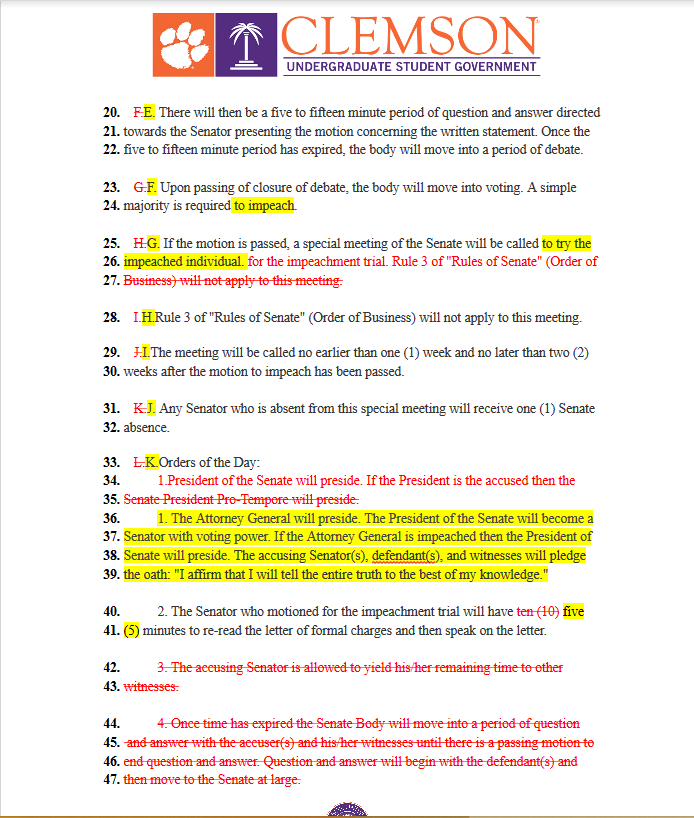In the fall of 2017, Articles of Impeachment were introduced against Student Body Vice President Jaren Stewart, after allegations of severe misconduct during Stewart’s time as a Residential Assistant surfaced. Student Undergraduate Senate held a thirteen hour trial to remove Stewart from his current position and fell two votes short of securing the required super-majority in order to oust the Student Body Vice President. Throughout this process, many within CUSG and those in the Clemson Community found the process of the trial to be confusing and inefficient. In response, Senator Mason Hammond introduced Senate Bill 45 to Undergraduate Student Senate. SB 45 is a constitutional amendment outlying the impeachment proceedings and the first proposed amendment since 2011. Last Monday, Senate overwhelmingly passed SB 45 sending it to a referendum on March 7th, the same day as the General Election and Senate elections. All undergraduates will be eligible to vote on the legislation.